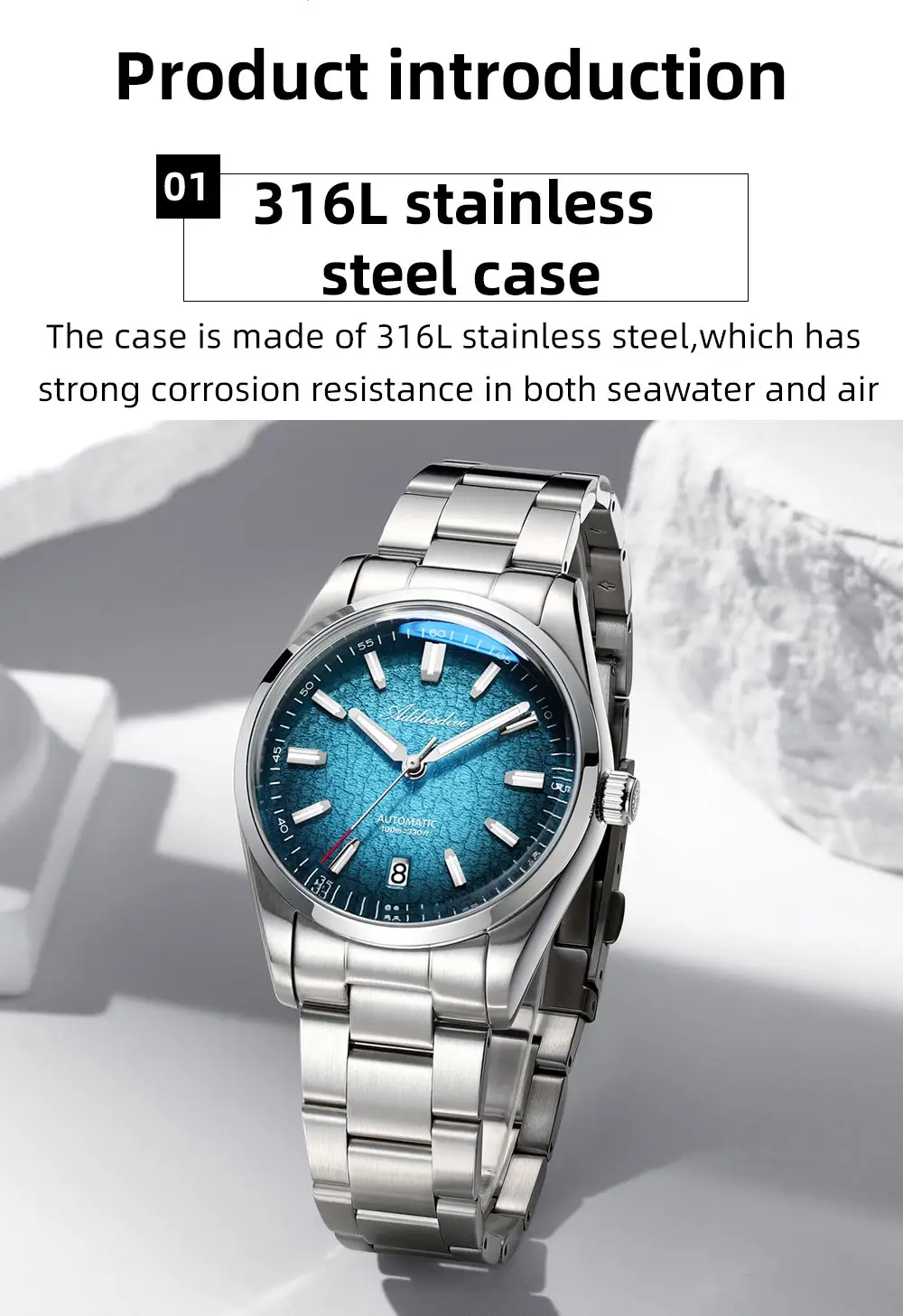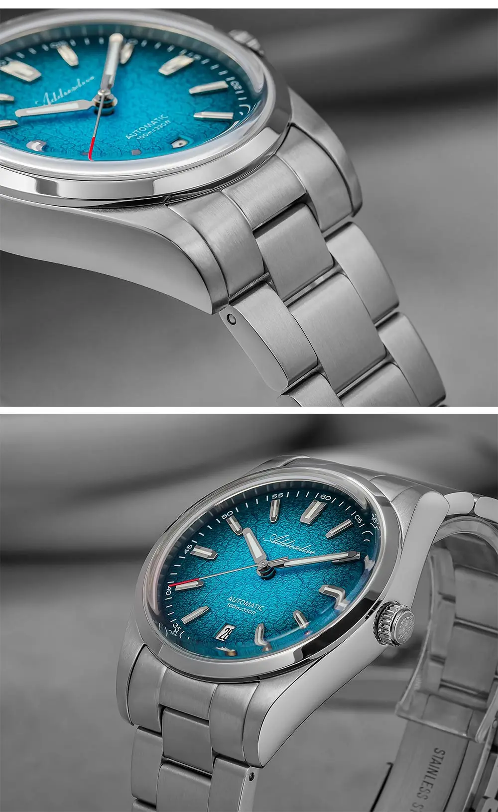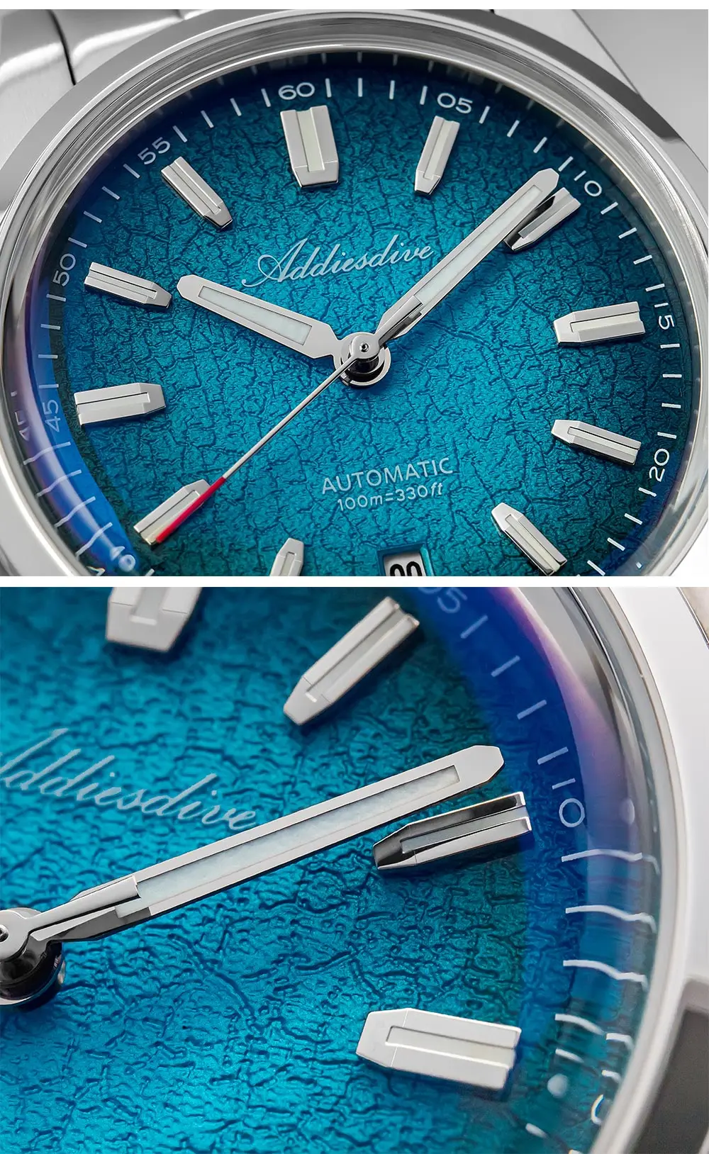 Design Highlights: Classic and stylish case design with brushed and polished finishes; enamel-like 3D oil-pressed gradient cracked pattern on the dial; multifaceted embossed indices with BGW9 Super Luminous application; embossed hands with BGW9 Super Bright Blue Luminous; K1 mineral bubble glass lens.