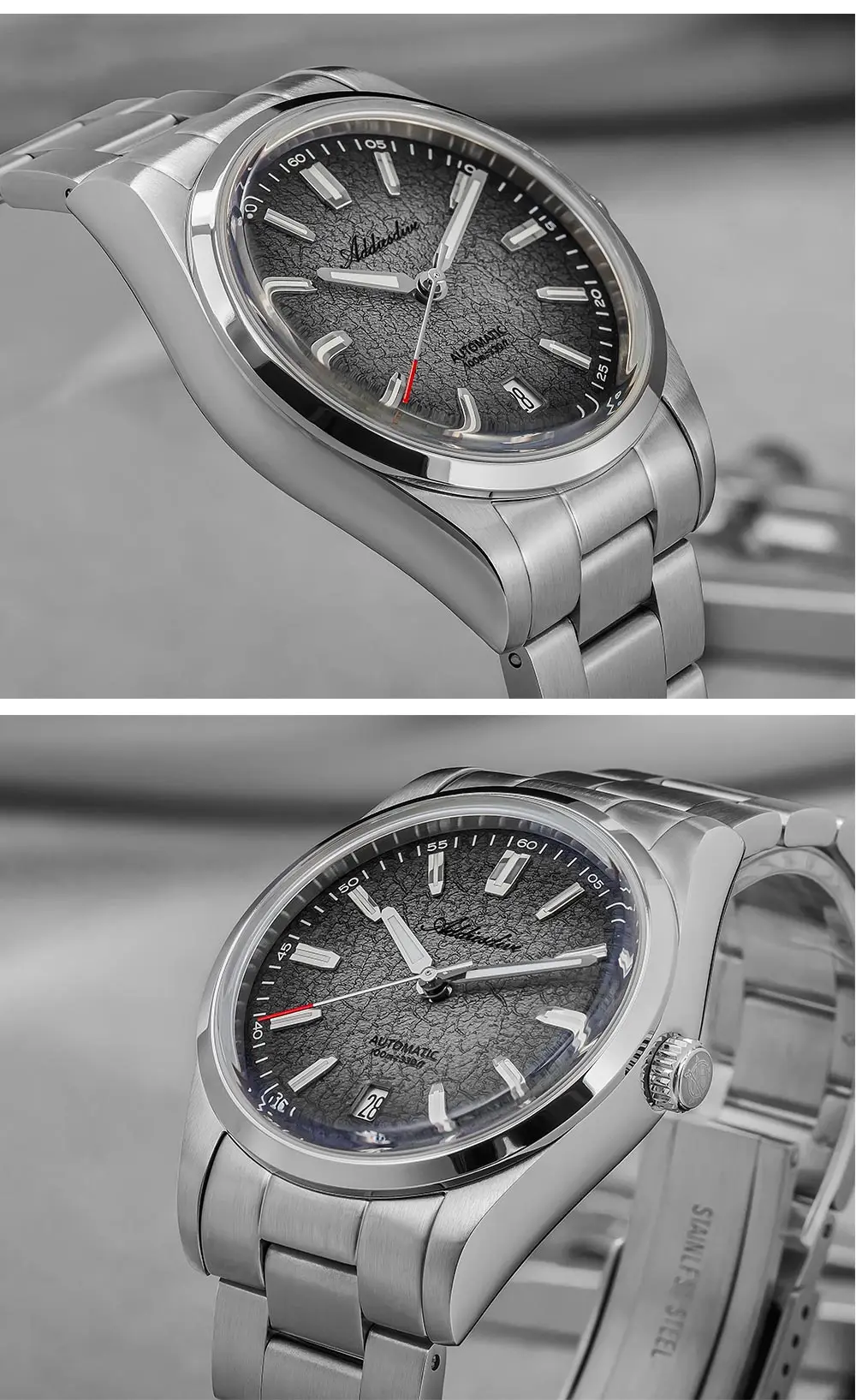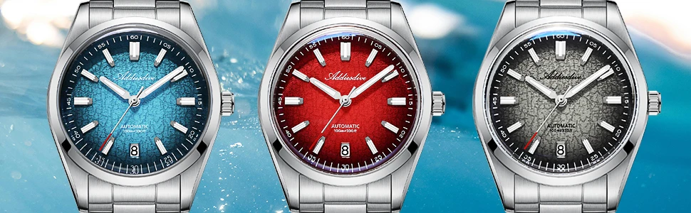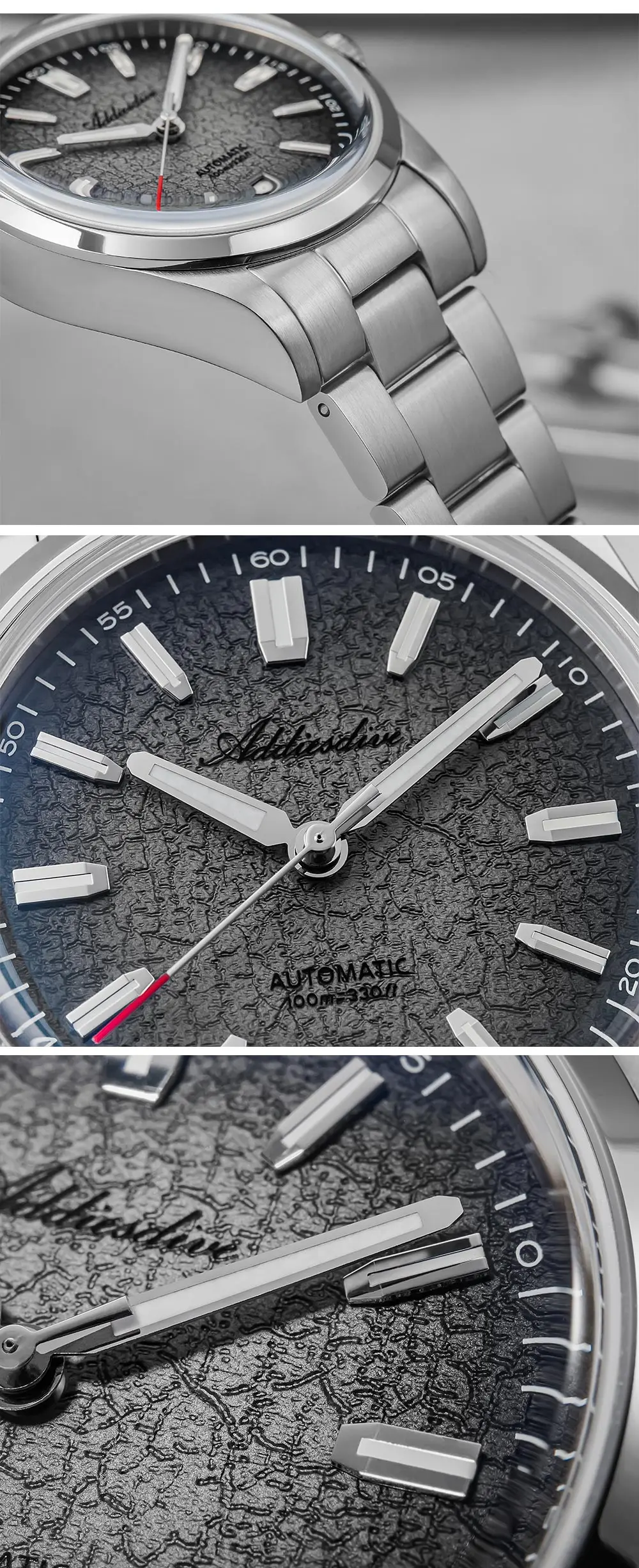 Design Highlights: Classic and stylish case design with brushed and polished finishes; enamel-like 3D oil-pressed gradient cracked pattern on the dial; multifaceted embossed indices with BGW9 Super Luminous application; embossed hands with BGW9 Super Bright Blue Luminous; K1 mineral bubble glass lens.