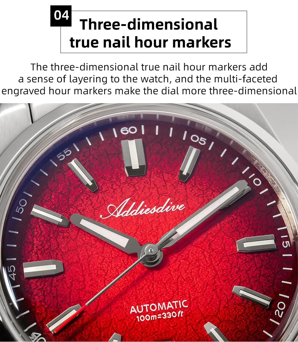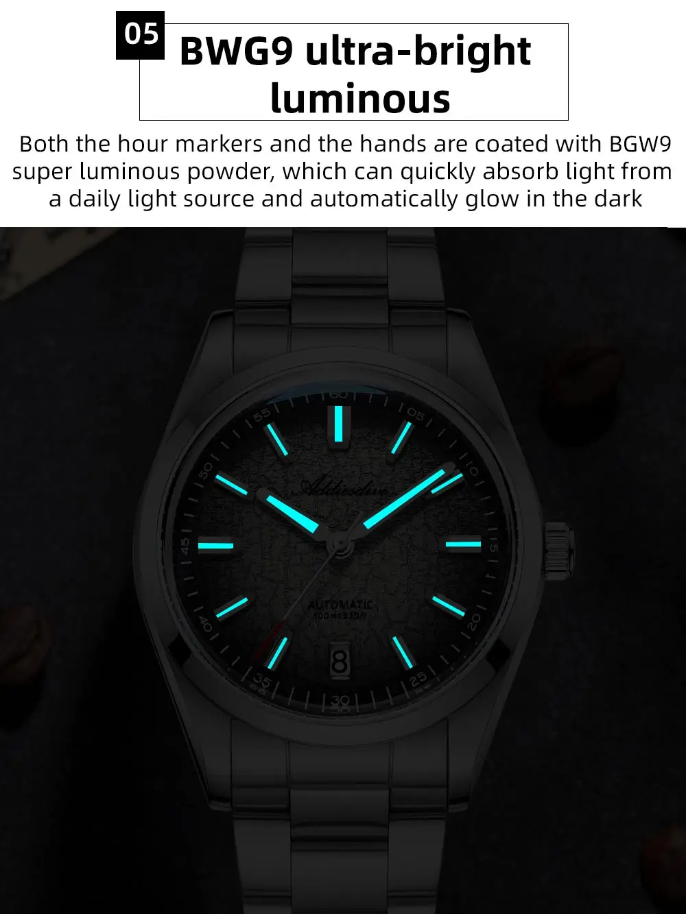 2.3D embossed gradient sunburst pattern on the dial with multi-faceted engraved markers 3.enhanced by BGW9 super luminous.